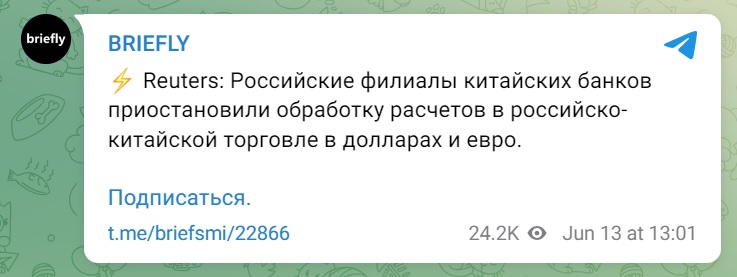 Експерти підкреслюють, що тепер ризик деградації валютних транзакцій з Китаєм на побоюваннях вторинних санкцій перетворився з гіпотетичного на реальність. Є висока ймовірність, що великі китайські банки уникатимуть будь-якої взаємодії з Мосбіржею, НКЦ і НРД, маючи досвід обмеженої участі у валютній інтеграції за відсутності санкцій.