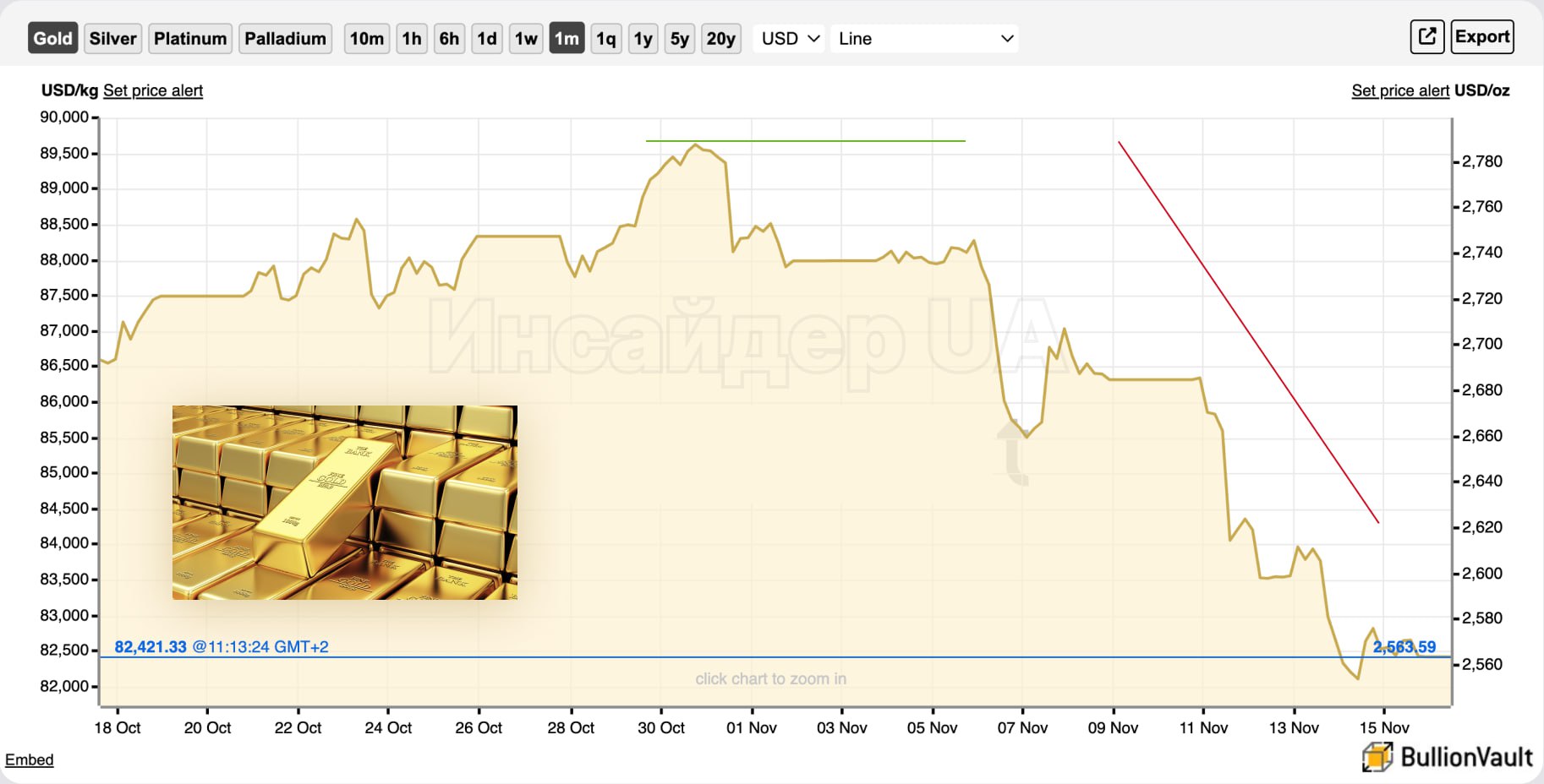 До середини листопада золото втратило 4% за тиждень, досягнувши $2565,49 за унцію. Це падіння було результатом зростання курсу долара й очікувань, що Федеральна резервна система США не настільки агресивно знижуватиме процентні ставки, як очікувалося раніше. У результаті метал став менш привабливим для інвесторів, а зміцнення долара зробило золото дорожчим для інвесторів, які використовують інші валюти.