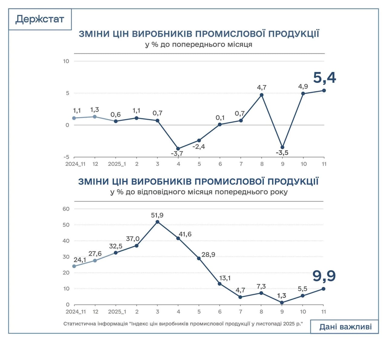 У листопаді 2025 року в Україні промислова інфляція збільшилась на 5,4% порівняно з попереднім місяцем. Про це у Facebook поінформувала Державна служба статистики.
