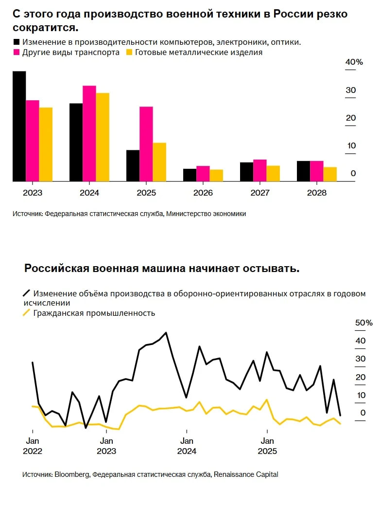 За три роки війни оборонні заводи забрали близько 800 тисяч працівників, знекровивши громадянську економіку. Це розігнало інфляцію та змусило Центробанк тримати високі ставки. За оцінюванням аналітиків, державні витрати вже близькі до межі, яку економіка здатна витримати без обвалу.