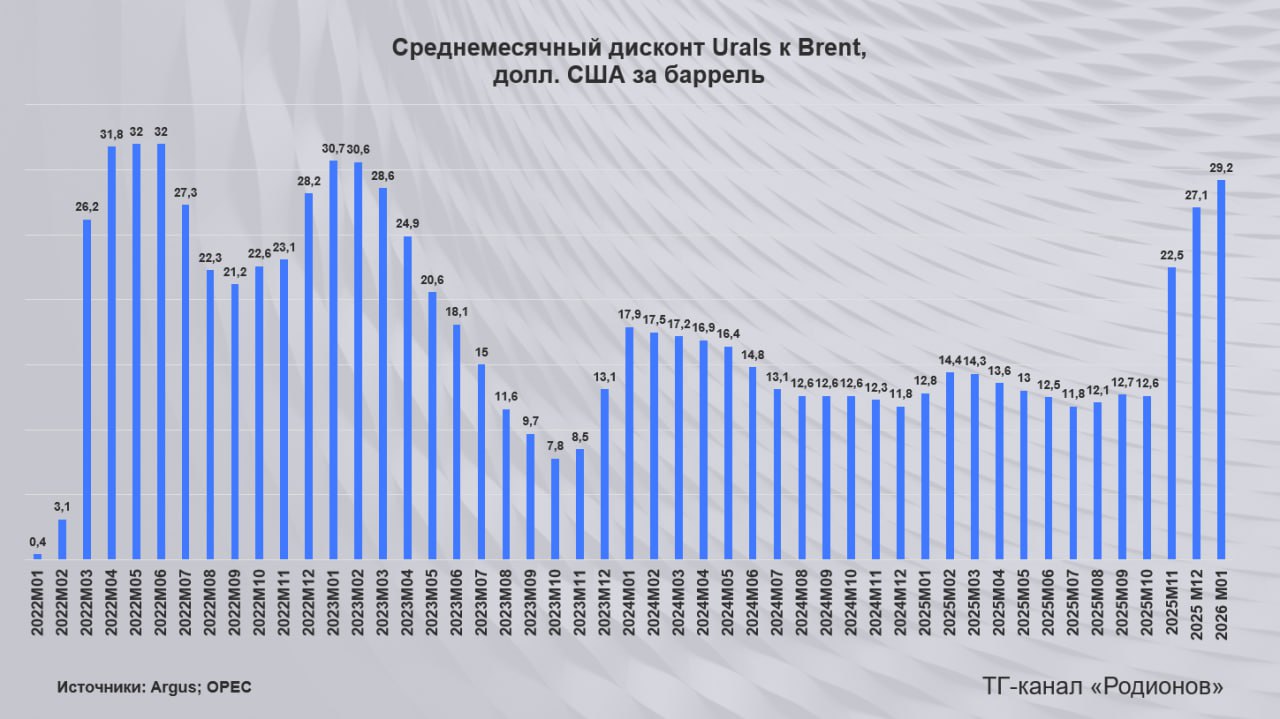Додатковим тривожним сигналом для Москви є цінові показники. За даними ОПЕК з посиланням на Argus, дисконт російської нафти Urals до еталонної Brent у січні 2026 року досяг трирічного максимуму - 29,2 долара за барель.