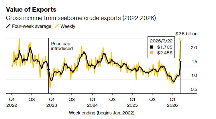 Станом на 22 березня тижневий виторг виріс до 1,71 млрд доларів проти 1,38 млрд тижнем раніше. Зростання забезпечили як саме подорожчання нафти, так і збільшення обсягів поставок. Останні три тижні російський експорт фактично подвоївся.