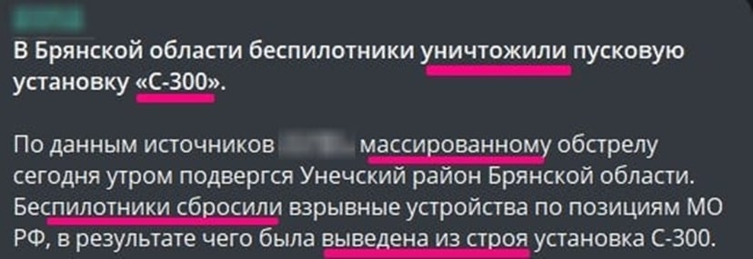 Джерело пише, що на території Ученського району Брянської області невідомий безпілотник скинув на систему "С-300" вибуховий пристрій. У результаті система вийшла з ладу.