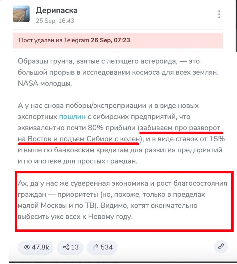 "NASA молодці. А у нас знову побори / експропріації та у вигляді нових експортних мит <...>. Ах так, у нас же суверенна економіка та зростання добробуту громадян - пріоритети (але, схоже, тільки у межах малої Москви та по ТБ). Мабуть, хочуть остаточно вибісити вже всіх до Нового року", - написав Дерипаска.