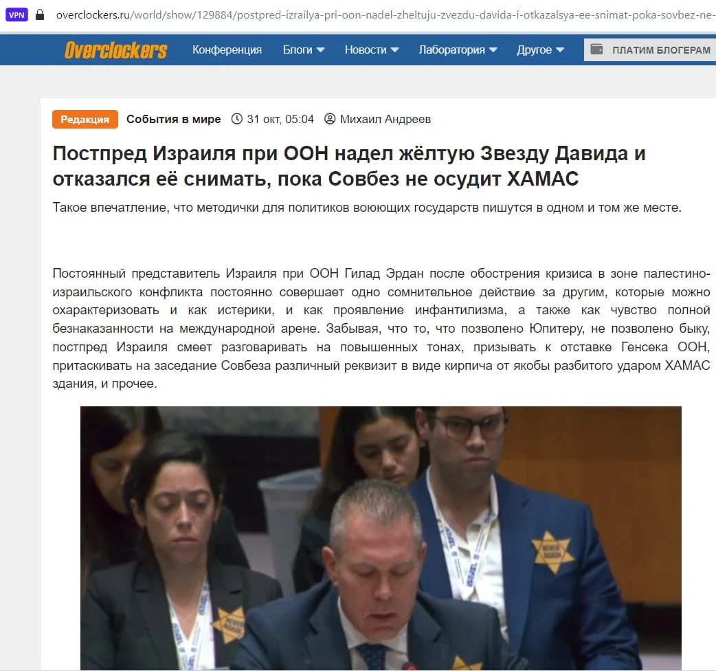 Одне точно: методички, за якими свою поведінку вибудовують функціонери держав, що перебувають у стані збройного конфлікту, пишуть в одному й тому ж місці. Той популізм укупі з проявом спраги чужої уваги, яким зараз займається постпред Ізраїлю при ООН, нам дуже нагадує дії "політиків" із сусідньої з Росією держави", - пишуть РосЗМІ, явно натякаючи на Україну.