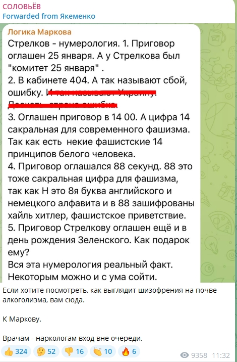 "Стрєлков. Нумерологія. Вирок оголошено 25 січня. А у Стрєлкова був "комітет 25 січня". У кабінеті 404. А так називають збій, помилку... Вирок оголошено о 14:00. А цифра 14 сакральна для сучасного фашизму, оскільки є якісь фашистські 14 принципів білої людини. Вирок оголошували 88 секунд. 88 - це теж сакральна цифра для фашизму, (...) у 88 зашифровано "Хайль Гітлер" - фашистське привітання... Уся ця нумерологія - реальний факт. Деяким можна і з глузду з'їхати", - написав Марков.