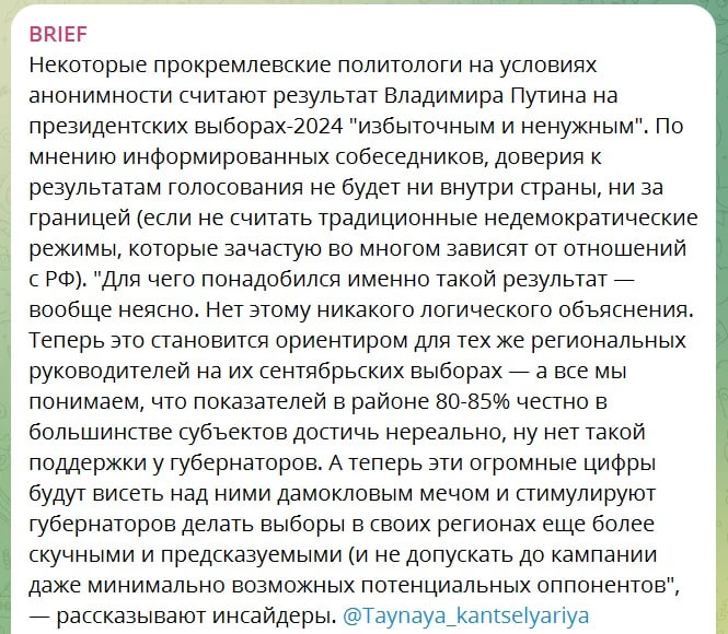 Ці дані викликають серйозні запитання щодо дійсної підтримки Путіна, поточного режиму, його легітимності та легітимності всього виборчого процесу. Спостерігачі зазначають, що надлишкові цифри мають неправдоподібний вигляд і Кремль сильно перестарався, намагаючись намалювати приємні для Путіна цифри.