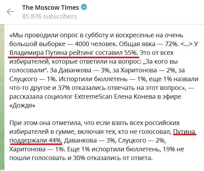 Згідно з даними проєкту ExtremeScan, не більше 55% голосів було віддано за Путіна. Це кардинально відрізняється від офіційно заявлених результатів.