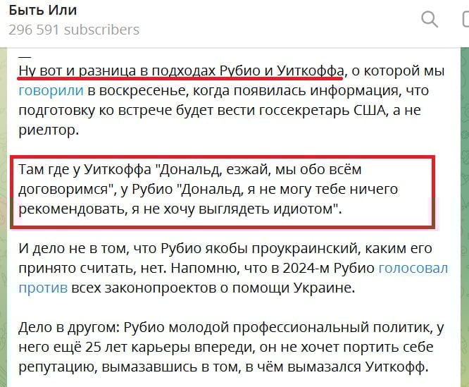 CNN пише, що зустріч Рубіо та Лаврова, запланована на цей тиждень, була відкладена. Таким чином, план Путіна затягнути переговори ще довше, ймовірно, впав. Рубіо набагато компетентніший, ніж торговець нерухомості Уіткофф.