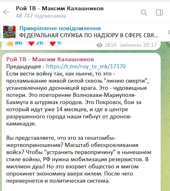 "Мене вже до білого розжарювання доводять твердження нашого керівництва про те, що нам, мовляв, потрібно не просто перемир'я, а усунення першопричини конфлікту між РФ і Україною. Що ви маєте на увазі, та як усувати зібралися? (...) Якщо вести війну так, як нині, то це проламування живою силою крізь "лінію смерті", встановлену дронницею ворога. Це жахливі втрати! (...) Ви уявляєте, що це за гекатомби-жертвоприношення? Масштаб знекровлення військ?" - написав розлючений Калашников.