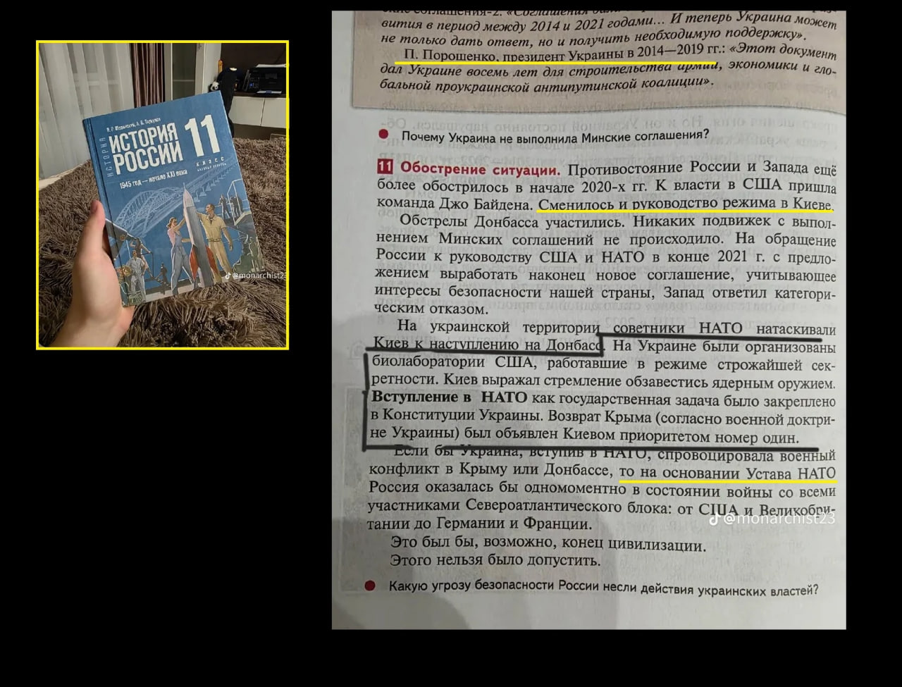 У кожному абзаці нового підручника відчувається нервова рука кремлівської пропаганди, наголошують експерти. Більше того, звинувачення виглядають настільки безглуздо та смішно, що новий підручник уже став мемом. Автори звинувачують Україну у створенні "американських біолабораторій", у підготовці "наступу на Донбас", у "планах щодо створення ядерної зброї" та навіть у тому, що "повернення Криму" нібито було головною військовою метою Києва.
