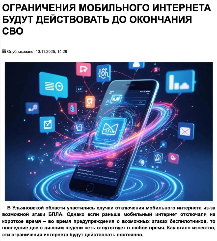 Як заявили представники регіонального уряду РФ, в Ульяновській області доступ до мобільного Інтернету буде обмежений на невизначений термін, аж до закінчення так званої "спеціальної військової операції". За словами міністра цифрового розвитку області Олега Ягфарова, місцева влада не може вплинути на ситуацію.