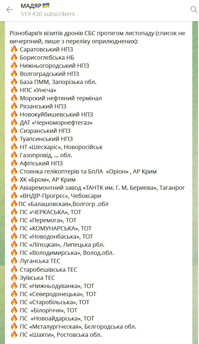 У листопаді українські "Птахи" Мадяра провели рекордну кількість ударів углиб Росії: 108 бойових вильотів і 88 уражених об'єктів від НПЗ і терміналів до підстанцій і ТЕС.
