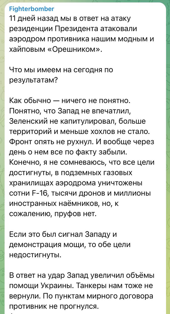 Показова атака, яку Кремль подавав як "сигнал" Україні та Заходу, не дала жодного помітного ефекту. Fighterbomber визнав, що Україна не здригнулася, фронт не посипався, а мир не став ближчим.