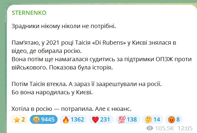 Блогерку з України Таїсію Маламан, відому під ніком Di.Rubens, яка раніше публічно заявляла про свою любов до Росії та переїхала туди, була затримана російською поліцією у Санкт-Петербурзі. Про це вона сама повідомила Telegram.