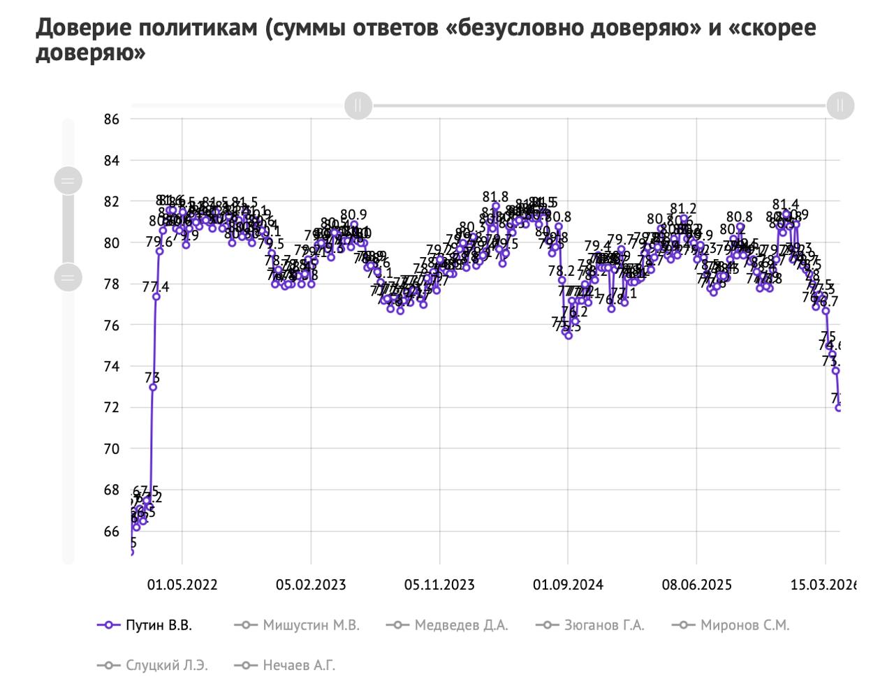 Водночас падає і рівень схвалення діяльності президента: за тиждень він скоротився до 66,7%, втративши близько 6,6 в.п. Аналогічна динаміка спостерігається і в інших інститутах влади: знижується підтримка уряду та, зокрема, прем'єра Михайла Мішустіна.