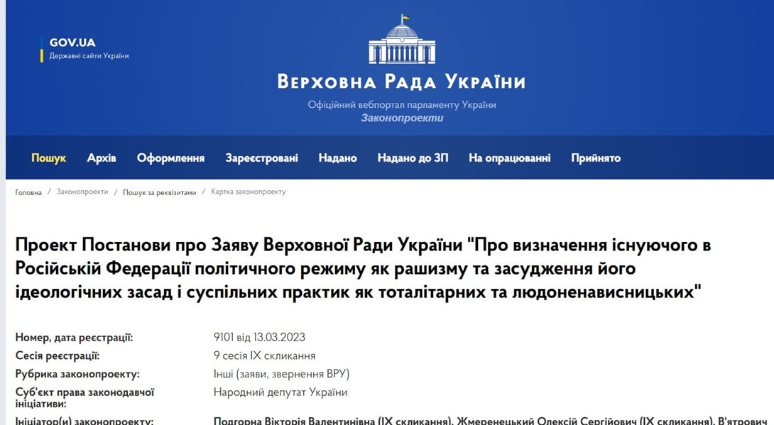 Народні депутати пропонують не тільки закріпити чітке визначення режиму, але також засудити його ідеологію, яка побудована на тотальній ненависті до людства.