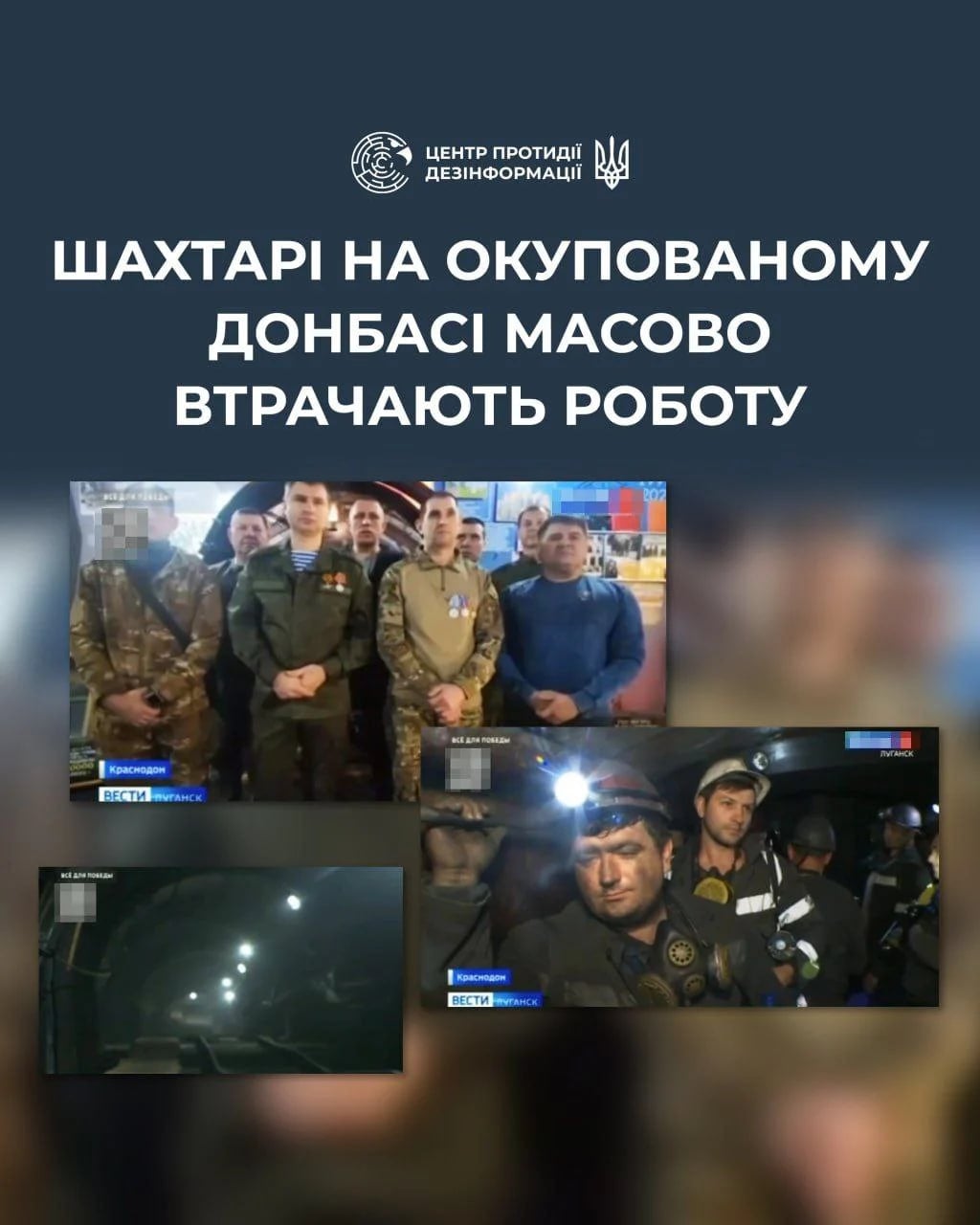 Як повідомляє Центр протидії дезінформації, у Сорокіному, окупованому російськими військами у 2014 році, шахтарі записали відеозвернення до диктатора Путіна. У ньому вони заявили про катастрофічне становище вугільної галузі: видобуток вугілля постійно падає, підприємства позбавлені доступу до кредитів, а люди залишаються без засобів для існування.