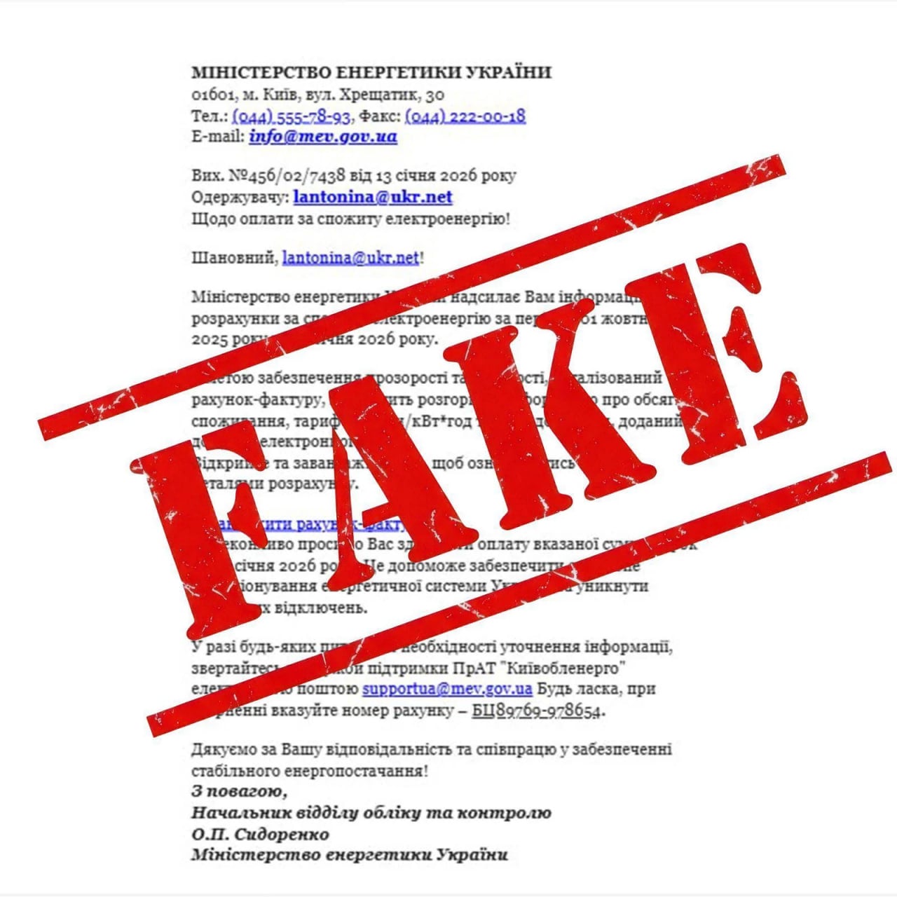 Громадян закликають не відкривати такі файли, не переходити за посиланнями та не робити оплату. Відомство просить про максимальне поширення інформації про фішингові атаки та нагадує, що довіряти слід лише офіційним каналам комунікації Міністерства енергетики.