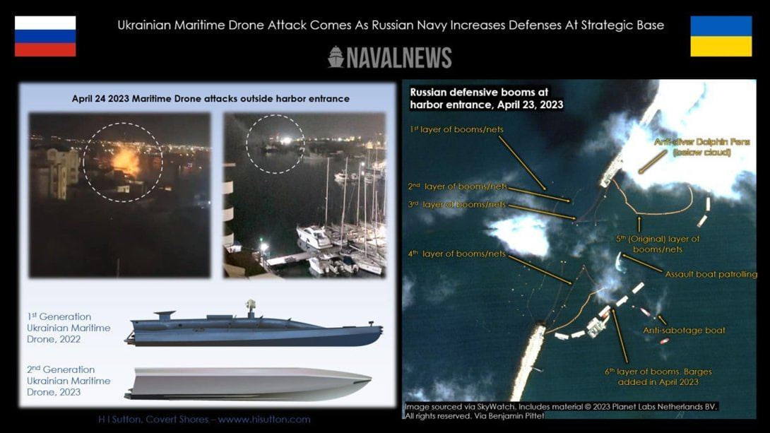 Газета британського флоту NavalNews стверджує: страх у загарбників настільки великий, що на вході у Севастопольську гавань облаштували шість шарів сіток і бетонних загороджень. Крім цього, охорону півострова посилили катерами та навіть дельфінами, які навчені атакувати дайверів.