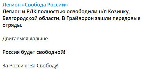 У цей час добровольчий Легіон "Свобода Росії" повідомив, що його підрозділи зайняли Козинку Бєлгородської області, а у центр Грайворон "заходять передові загони".