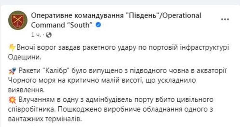 Про це повідомили в Оперативному командуванні "Південь" на їхній сторінці у Facebook.