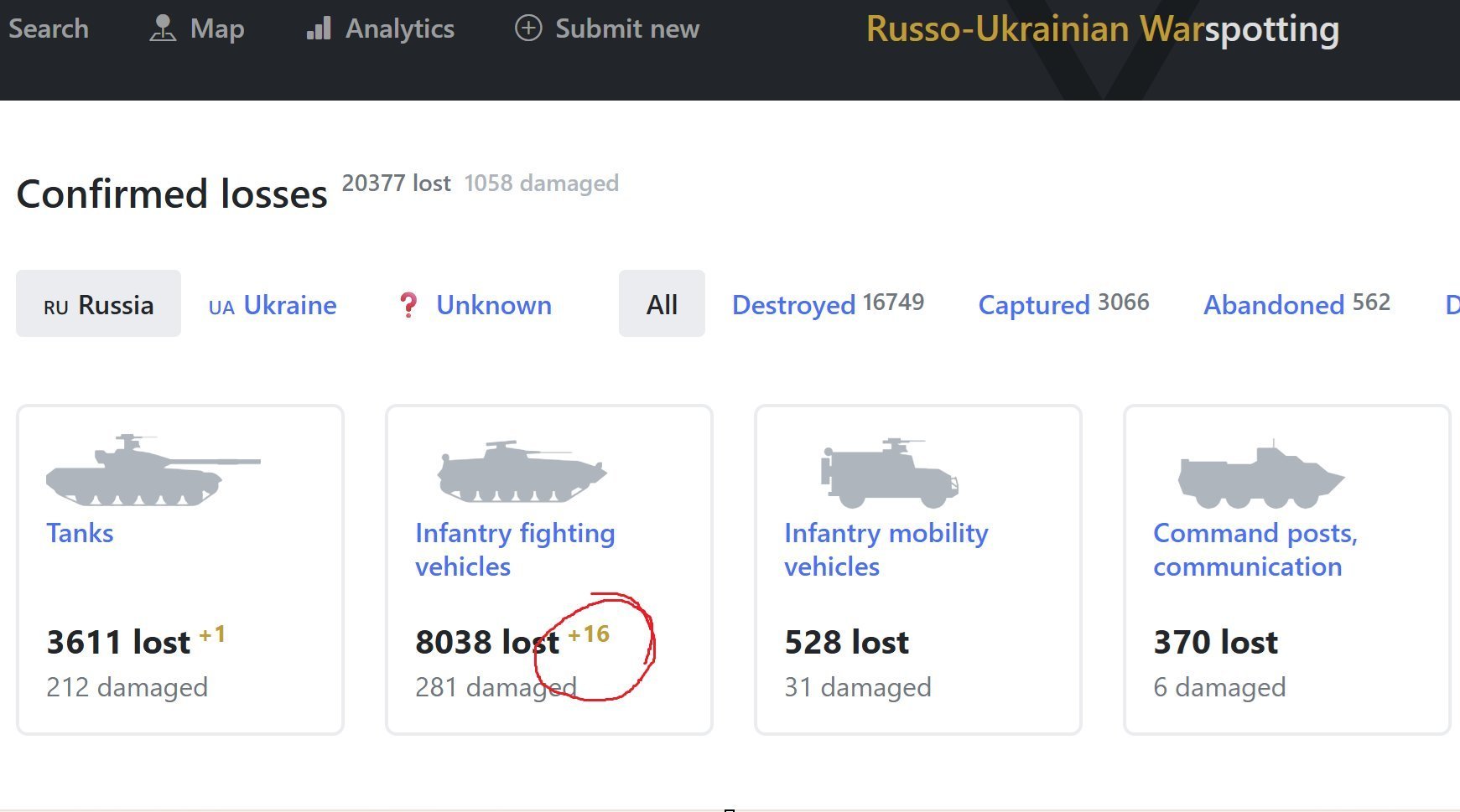OSINT-аналітик Річард Верекер заявив, що за минулі 24 години було зафіксовано більше втрат серед російських БТР і БМП, ніж за вересень.