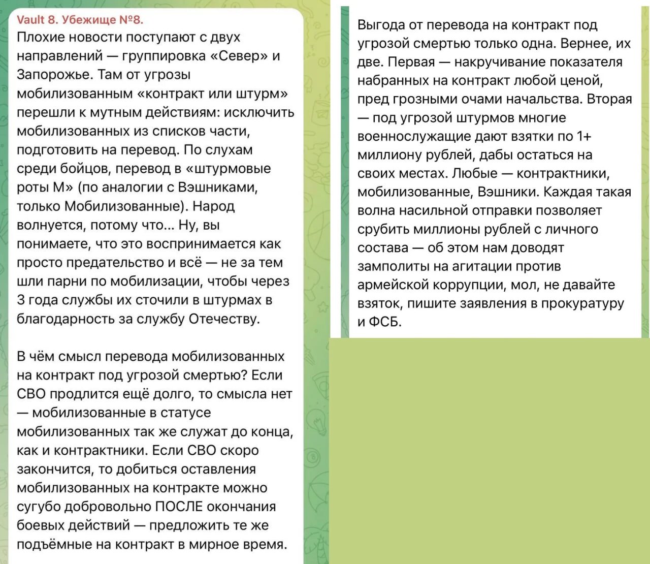 Мобілізовані розповідають, що кілька років служили у тилу чи на звичайних позиціях, і тепер їм раптово загрожують: або підписуй контракт, чи підеш у М-роту на штурм. Від "м'ясного штурму" можна відкупитися величезним хабарем.