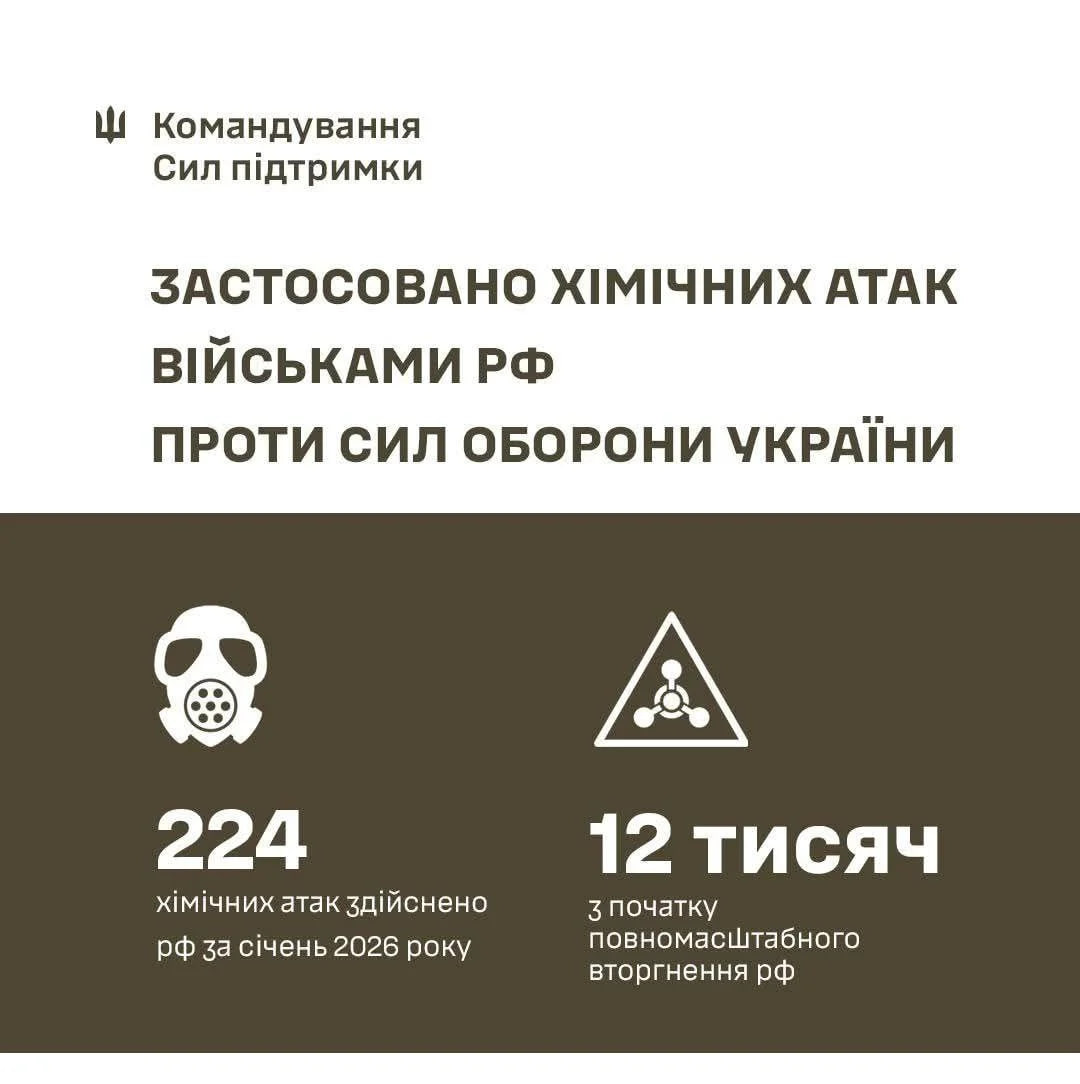 В Україні продовжують документувати факти застосування російських військ небезпечних хімічних речовин. За даними підрозділів радіаційного, хімічного та біологічного захисту, лише у січні 2026 року зафіксовано 224 випадки використання боєприпасів, оснащених подразнювальними газами.