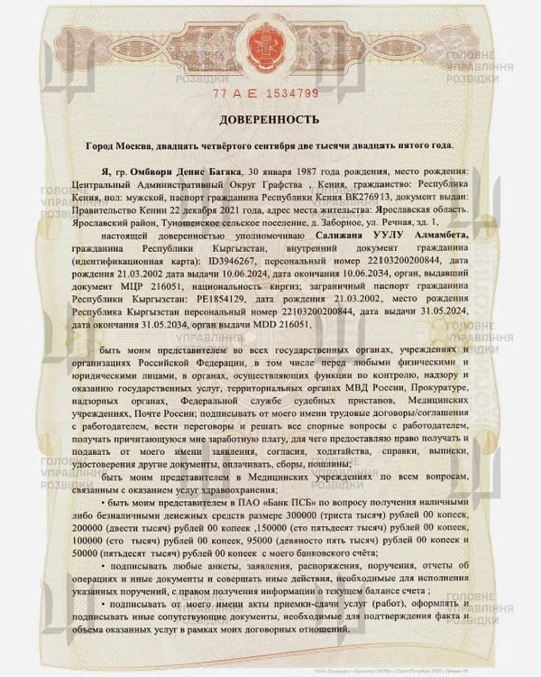Самі африканці жодних контрактів із армією РФ не підписували, за них це зробив громадянин Киргизстану Саліжан Уулу Алмамбет. "Довірена особа" в Ярославлі одержала повний контроль як над їхніми долями, так і над банківськими рахунками.