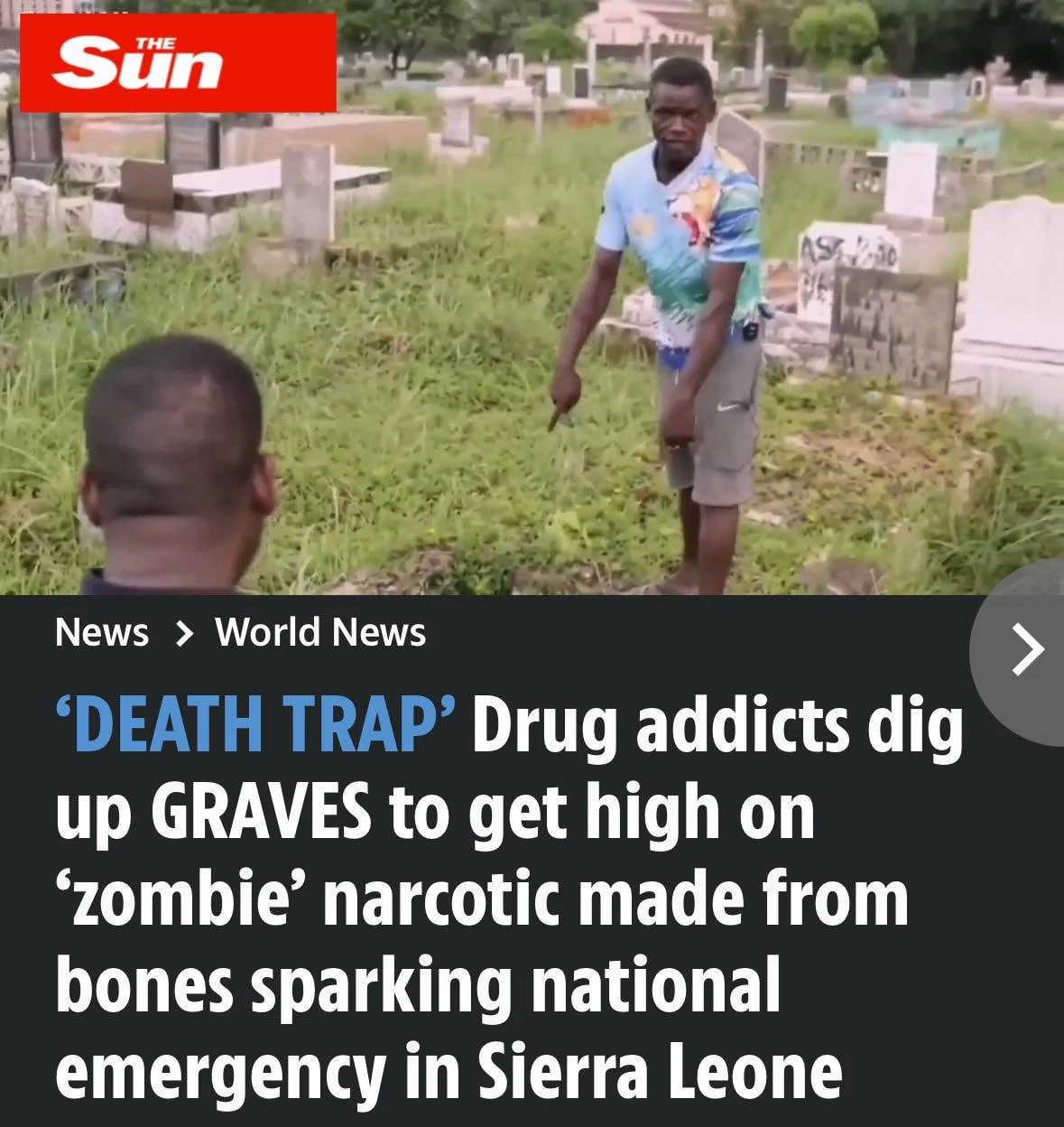 У невеликій африканській Сьєрра-Леоне оголошено надзвичайний стан через тотально збільшену наркотичну залежність місцевого населення від наркотичної речовини куш. Повідомляють, що наркозалежні мародери масово розкопують могили, щоб дістати звідти кістки, які тліють, і виготовити з них наркотик, що перетворює людину на зомбі, пише видання The Sun.