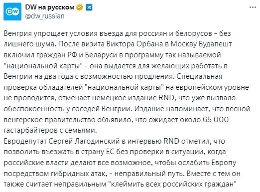 Громадяни РФ і Білорусі були включені до програми "національної карти", яка дає право на роботу в Угорщині щонайменше на два роки. Нею вони отримали право потрапляти до цієї держави Євросоюзу без додаткових перевірок з безпеки.