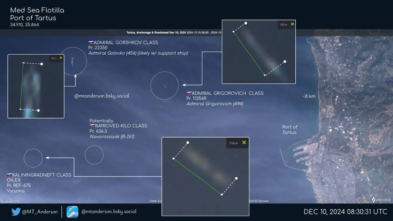 Супутникові знімки від 5 та 6 грудня показали наявність Військово-Морського флоту РФ у Тартусі, проте знімки за 9-11 грудня показують їхню відсутність у порту.