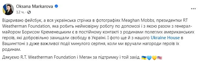 У свою чергу, посол України у США Оксана Маркарова підтвердила участь фонду Моббс у підтримці Києва, подякувавши її. Дипломат у себе у Facebook опублікувала фото із главою RT Weatherman Foundation, яке було зроблено в Українському домі у Вашингтоні під час вшанування сімей загиблих на війні в Україні американських добровольців.