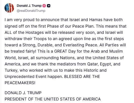 Через деякий час на своїй сторінці у Truth Social глава Білого дому озвучив перші деталі мирної угоди між Ізраїлем і ХАМАС.