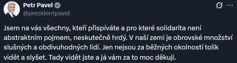 Президент Чехії Петр Павел висловив подяку громадянам: "Я неймовірно пишаюся всіма вами, хто робить свій внесок і для кого солідарність не є абстрактним поняттям... Винятковий результат. Це сильний сигнал здатності чеського суспільства виявляти солідарність у важкі часи".