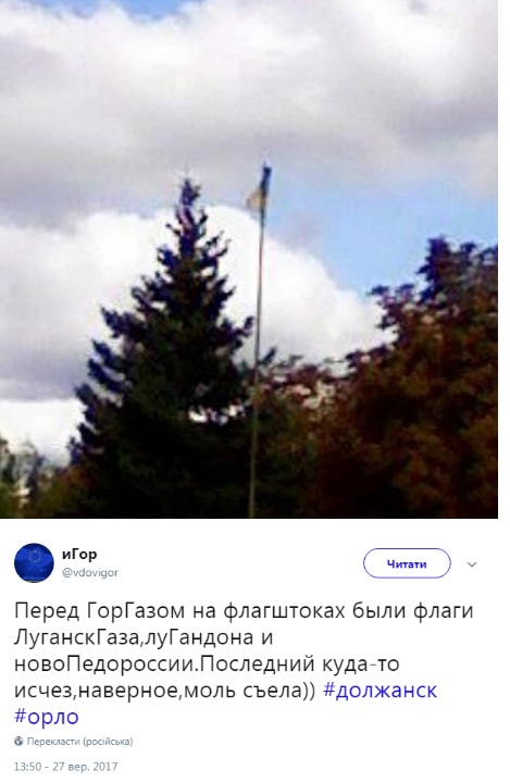 Пользователи указывают, что с флагштока около стадиона имени Горюшкина и со здания горгаза города Должанска (Свердловска), местные жители сняли тряпки "ЛНР". Возле стадиона вскоре подняли флаг Украины.