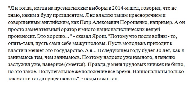 Ярош отмечает, что еще 3 года назад, накануне президентской кампании 2014 года, он честно говорил, что не имеет представления, какой из него может быть глава государства. Впрочем, по словам политика, из украинского воина получился бы, как минимум, неплохой главнокомандующий, который хорошо ориентируется в вопросах войны.