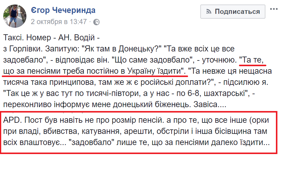 При этом сам Чечеринда остался удивлен тем, что ни боевики у власти, ни убийства и пытки не вызывают возмущения местных - их беспокоит и "задалбывает" лишь постоянная езда за соцвыплатами в Украину.