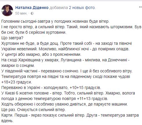 Синоптик Наталья Диденко в Facebook сообщила, что 5-6 октября Украину "атакует" сильный ветер, дожди на западе и севере нашей страны.
