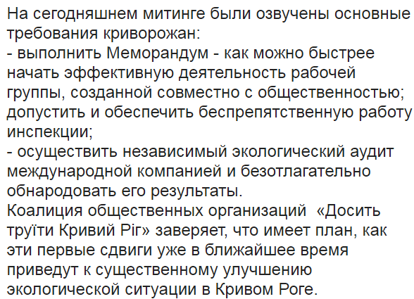 В Кривом Роге 9 октября несколько сотен человек вышли на митинг. Акцию протеста устроили из-за загрязнения воздуха одним из металлургических предприятий.