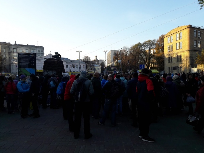 Всеукраинское объединение "Свобода" с самого утра собирает людей около станции метро "Арсенальная". Большинство из присутствующих - пенсионеры.