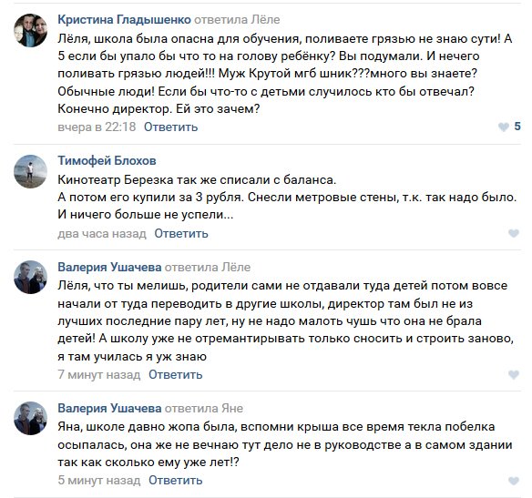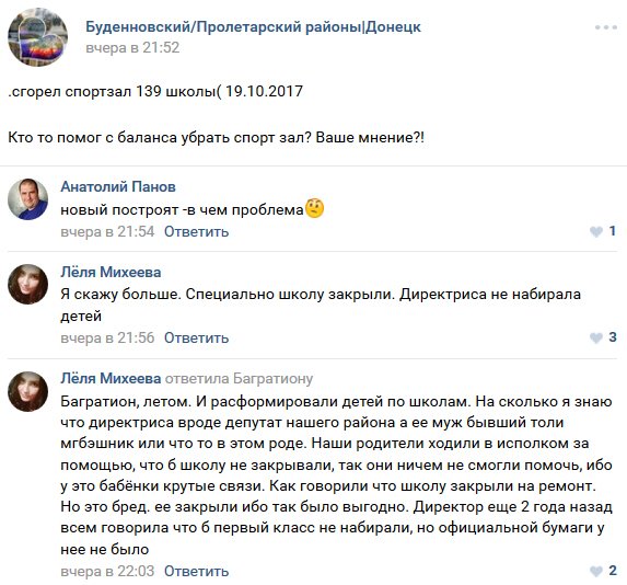 “Расформировали детей по школам. На сколько я знаю, директриса, вроде, депутат нашего района, а ее муж бывший то ли мгбэшник или что-то в этом роде. Наши родители ходили в исполком за помощью, что б школу не закрывали, так они ничем не смогли помочь, ибо у этой бабенки крутые связи. Как говорили, что школу закрыли на ремонт. Но это бред: ее закрыли, ибо так было выгодно. Директор еще 2 года назад всем говорила, что б первый класс не набирали, но официальной бумаги у нее не было”, - пишет одна из жительниц Донецка.