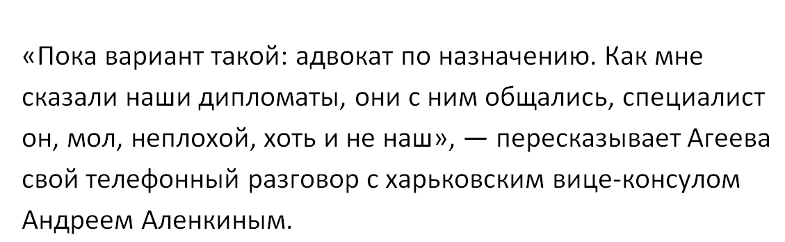 Она рассказала о том, что суд над ее сыном будет проходить в городе Новоайдарск, а защищать его будет бесплатный украинский адвокат, так как денег для обеспечения платного защитника российские власти Агееву не выделили.