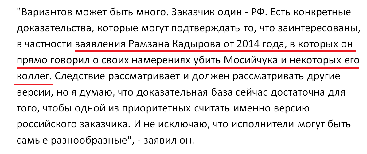 Советник Авакова отмечает, что вариантов по поводу заказчиков достаточно, но все следы ведут в Россию. При этом он напомнил о публичных угрозах со стороны Кадырова совершить убийство Мосийчука еще в 2014 году.