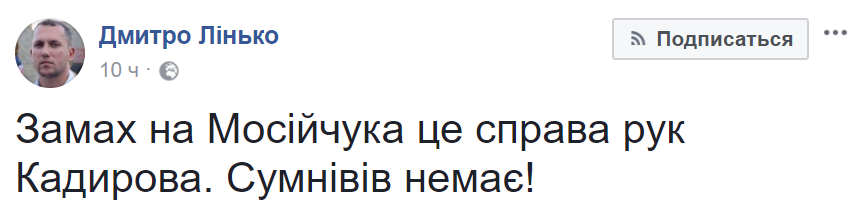 При этом коллега Мосийчука депутат Дмитрий Линько на собственной странице подтвердил, что нет никаких сомнений, что заказчиком убийства депутата был именно Кадыров.
