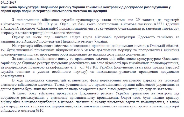 Военная прокуратура Южного региона Украины начала расследование рейдерского захвата территории военного городка в Одессе. В частности, надзорное ведомство изучат факт переноса забора представителями ТРЦ CityCenter.