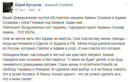 Журналист с грустью констатировал, что в результате жуткого нападения народный герой Украины Амина Окуева погибла, ее мужу Адаму Осмаеву удалось спастись, но он ранен.