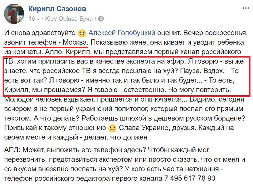 Сообщение Сазонова вызвало поддержку пользователей в соцсетях, а сам он позже опубликовал номер гостевого редактора российского ТВ, который собирает людей для своей московской студии.