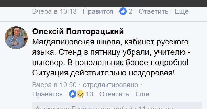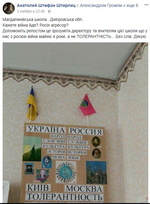 В Днепропетровской области в одной из школ Магдалиновки появился стенд о дружбе Украины и России. После резонанса в Сети плакаты из кабинета русского языка убрали, а учителю объявили выговор.